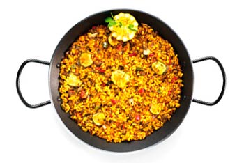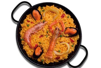 Mejillones, calamares, chirlas, pimiento verde, pimiento rojo, cebollita, azafrán, agua y sal